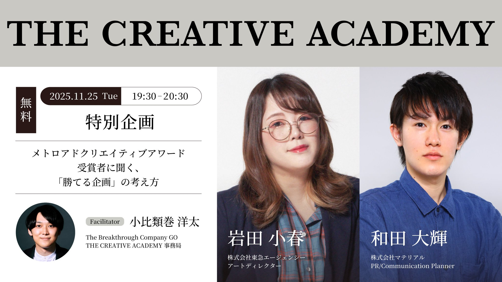 本イベントは、THE CREATIVE ACADEMY受講生限定のイベントとなっており、クリエイター・プランナーの登竜門として知られる「メトロアドクリエイティブアワード」の受賞者が“勝てる企画のポイント”について深掘りするトークセッションです。