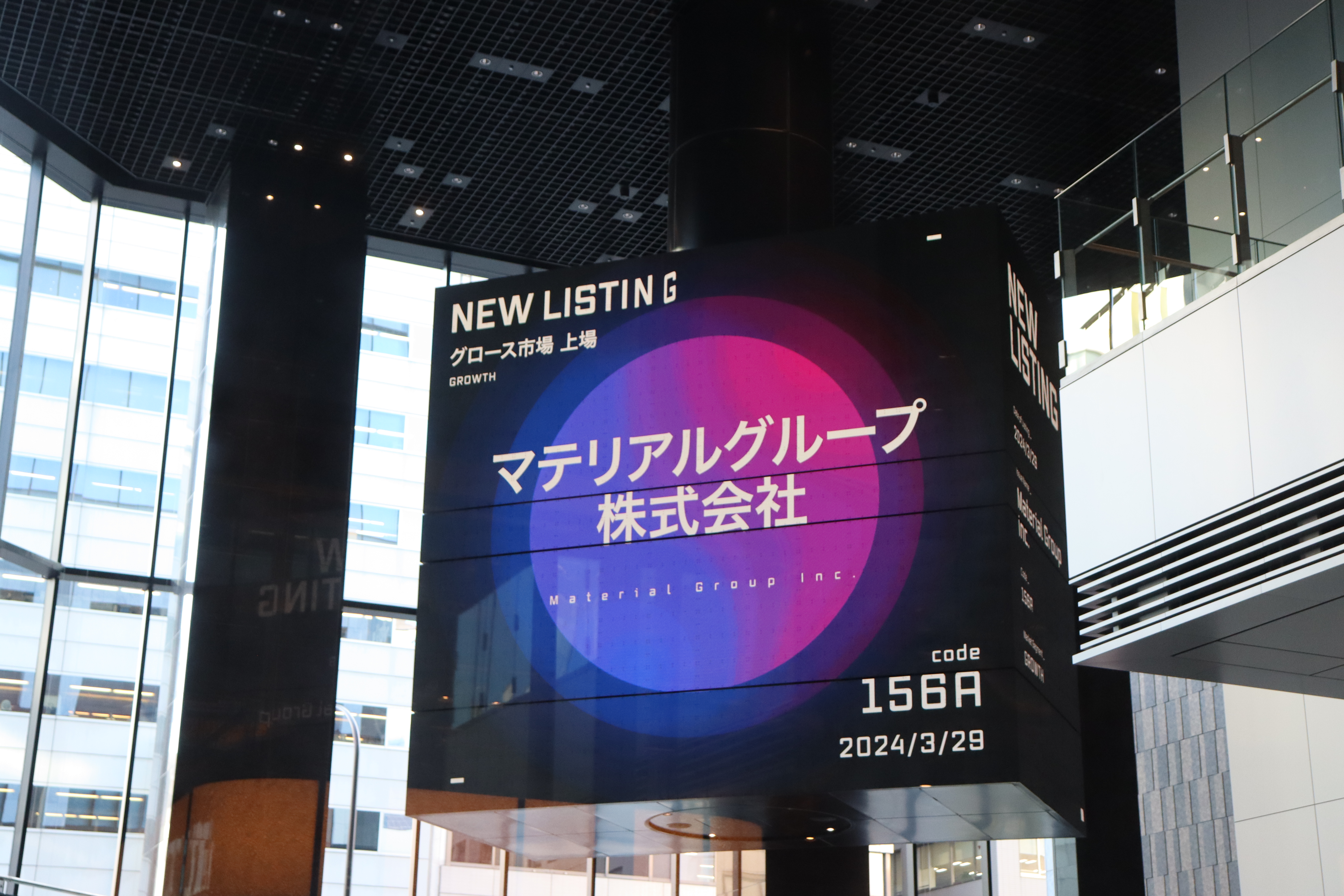 東証でのイベントは以上で終了です!その後、広報チームは現場に残り、上場祝いのサイネージ撮影に向かいました。KABUTO ONEビル内の大きな電光掲示板には、グループ名とお祝いの言葉が掲出されていました。