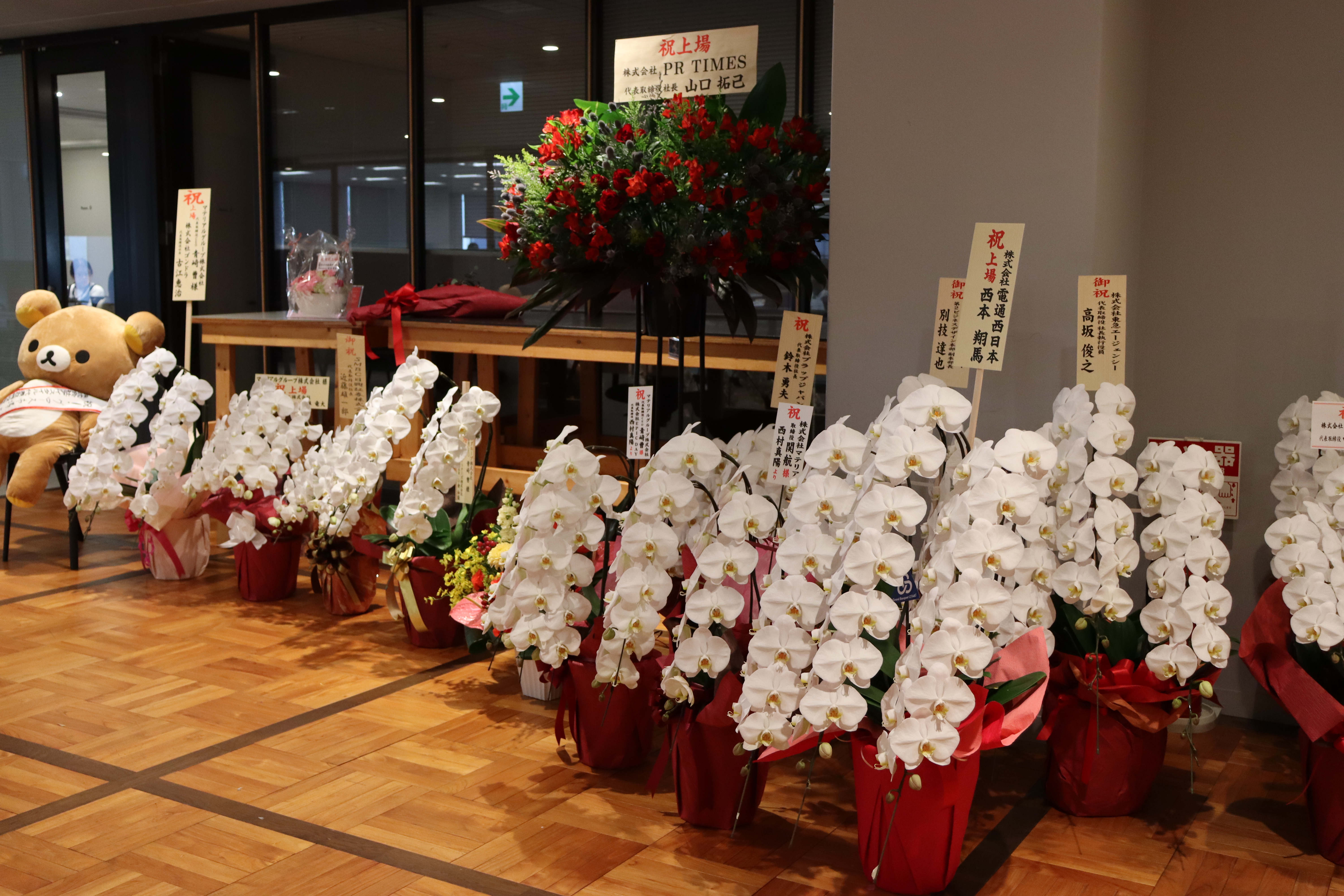 グループ経営陣は、一連のイベントの終わりにオフィスに集合。アーク森ビル前の桜を囲って記念撮影を目論んでいましたが、この日はまだ開花せず(涙)。これまで当社を支えてくださった関係各所の皆さまから、数え切れないほどの祝花をいただいたことが、何よりの励みとなりました。