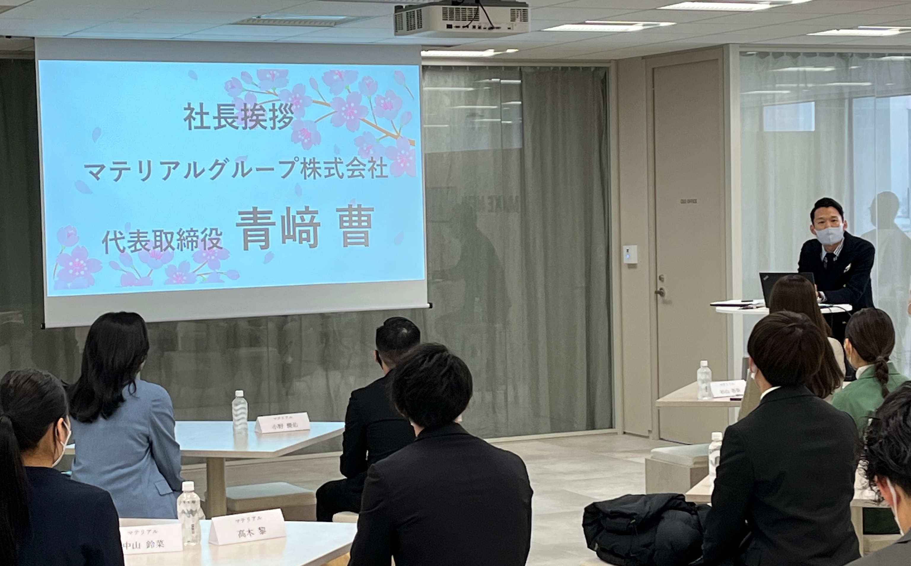 マテリアルグループ 代表の青﨑 からは 、 新入社員のみなさまへの歓迎の挨拶として、「社会人として一歩を踏み出す中で、純粋に心の底からでてきた“決意”を決して忘れないでほしい。そして、マテリアルグループのカンパニーバリュー“ にもあるように、時代の変化を恐れることなく、常に新しい可能性を創造し続けてほしい。」とふたつの願いが贈られました。