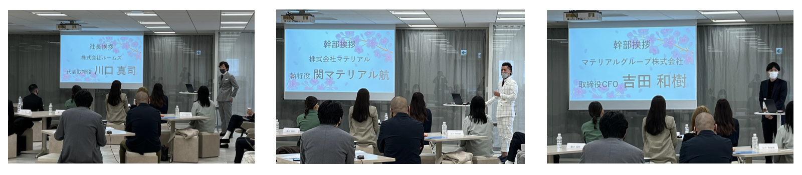 また、ルームズ代表の川口からは、「多くの経験をしていく中で、最初の決意を忘れずにいれば周りは気付いて必ず助けてくれる、仲間を大切にしてほしい」。取締役CFOの吉田からは、「成長に大きく関わるのは、 “素直さ”と“思考体力”を大切に、 ほしい」。執行役員 兼 Executive Storytellerの関からは、「、夢を見続けられる大人になってほしい」など、幹部陣それぞれからあたたかいメッセージが述べられました。