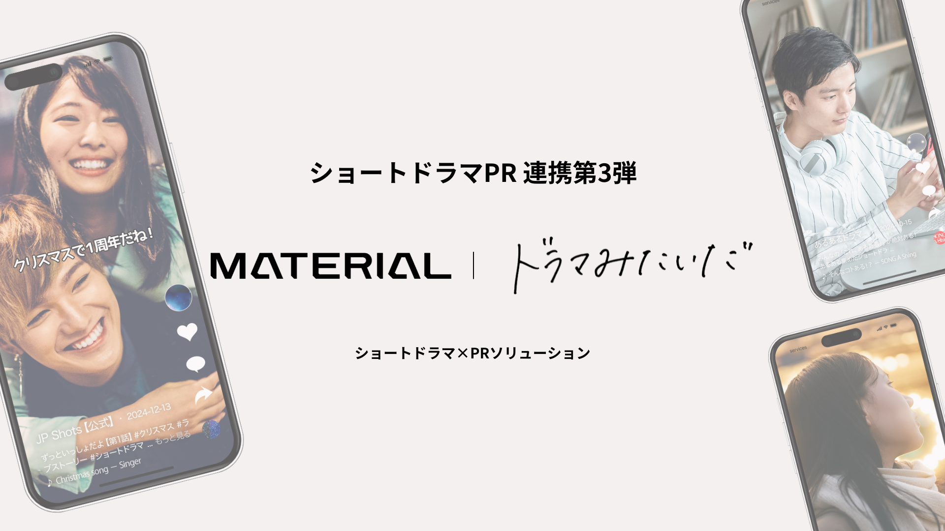 このたびマテリアルは、縦型ショートドラマ企画制作とPR活動支援のパッケージの「ショートドラマPR」において、開設からわずか2年で累計4億回再生を超える大人気ショートドラマアカウントの「ドラマみたいだ(運営会社:studio15株式会社)とのサービス連携を開始いたします。