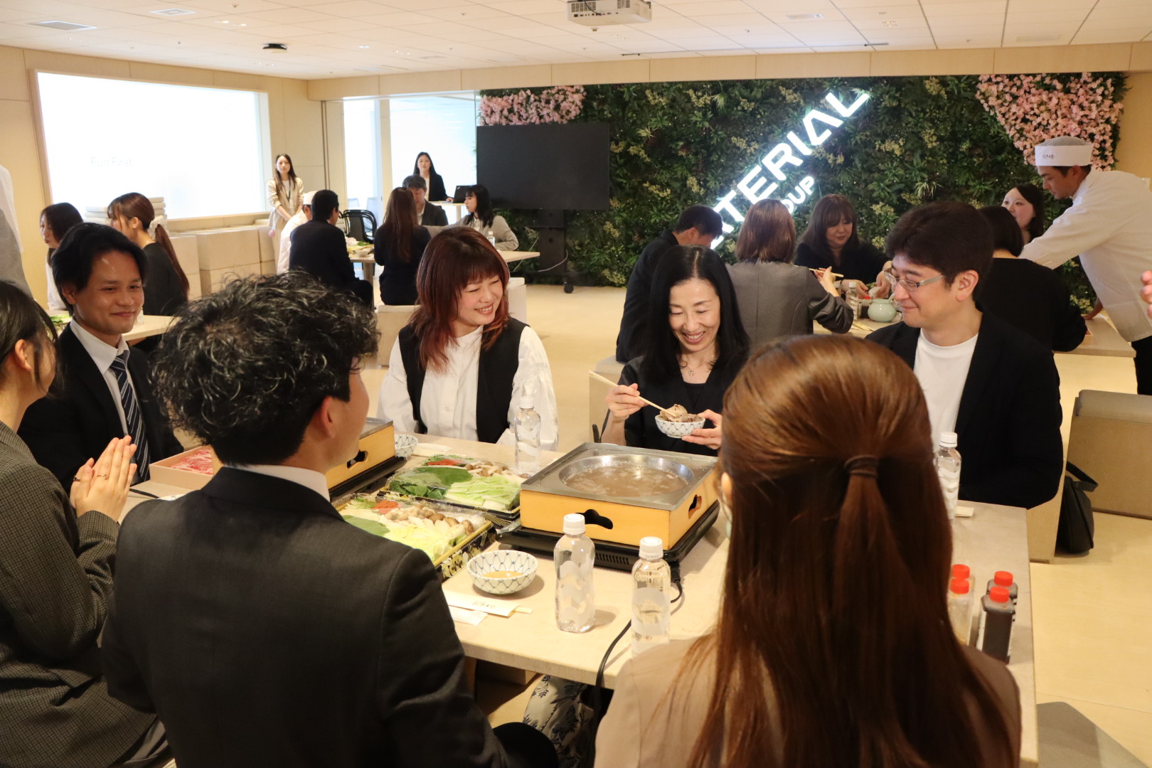 贈呈式後、オフィスのエントランスにて、滋賀県近江八幡市の老舗料理店「ひょうたんや」が提供するA5ランク近江牛のしゃぶしゃぶ(初任牛)を、割烹着姿の役員たちより振る舞い、新入社員とご家族がともに「初任牛」をおいしく実食しました。