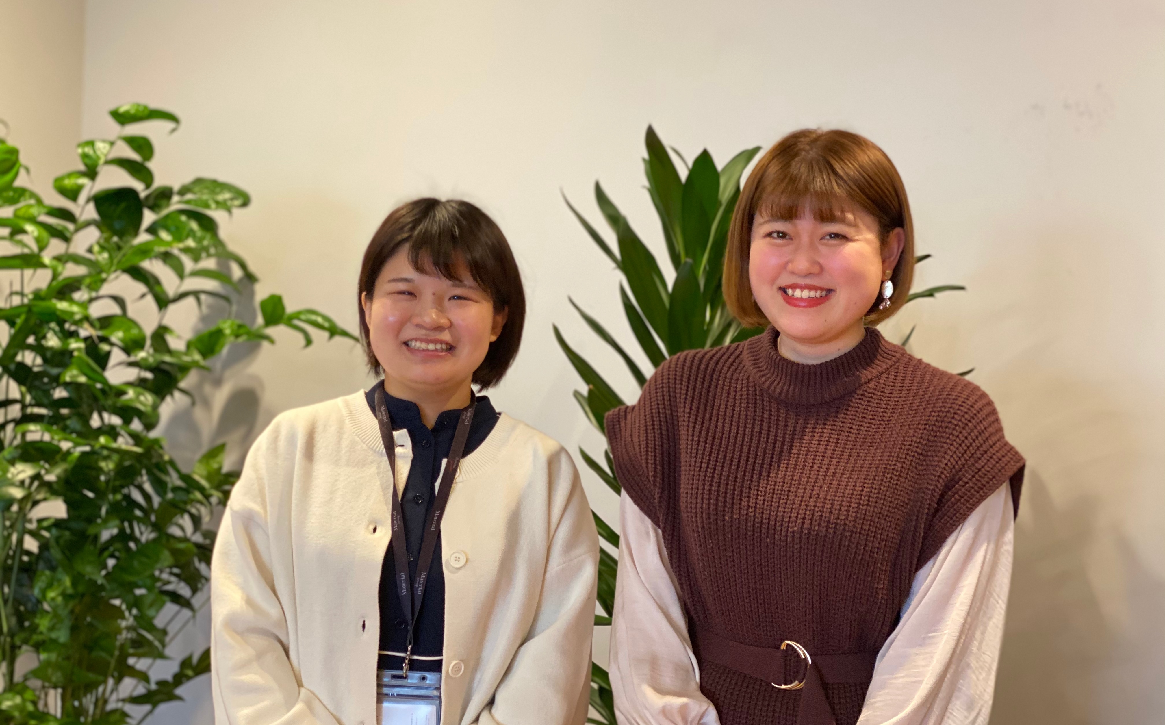 木津:私たち自身が、入社当時からリモートワークだったこともあり、先輩方となかなかコミュニケーションが取れずに苦労した経験があります。これからマテリアルに入社される方々には、同じような思いはしてほしくないという気持ちも強いので、継続して社内コミュニケーションを活性化させられる存在になってくれたら嬉しいです。