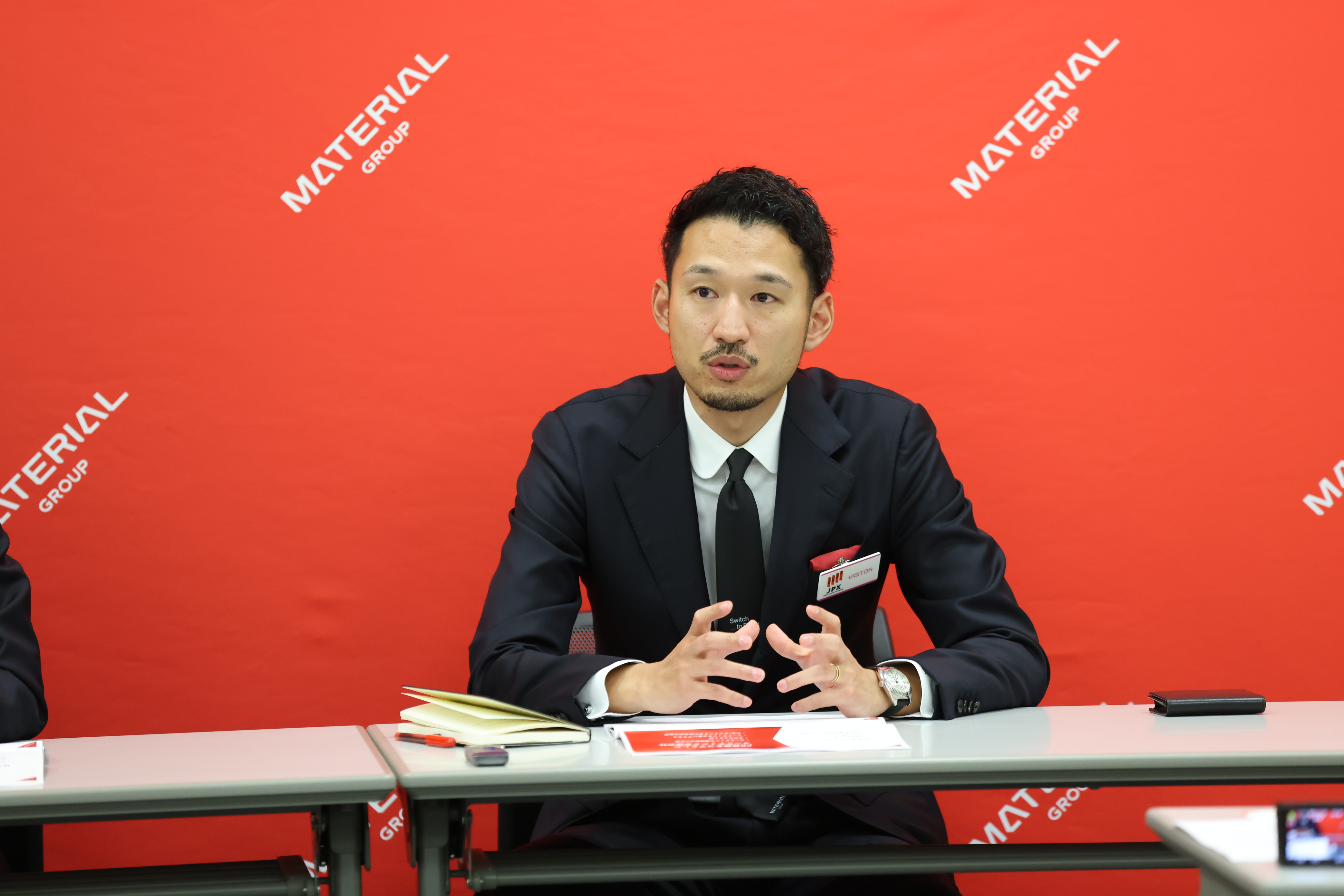 現地には、セレモニー参加者や見学者メンバーが続々と集まり、緊張感も高まっているなか、投資家向けニュースメディア「ストックボイス」にが出演。マテリアルグループの事業内容・PR業界の市場環境や今後の成長戦略についてお話しました。