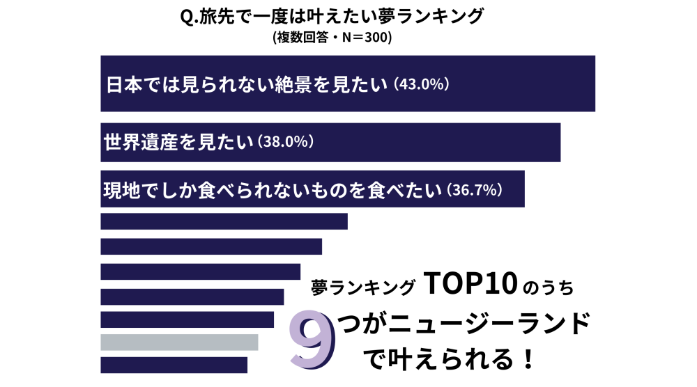 - 「旅先で一度は叶えてみたい夢」のほとんどがニュージーランドで体験できるなど、旅先メディアだけではなく、一般メディアにも親和性のある調査結果を提供した