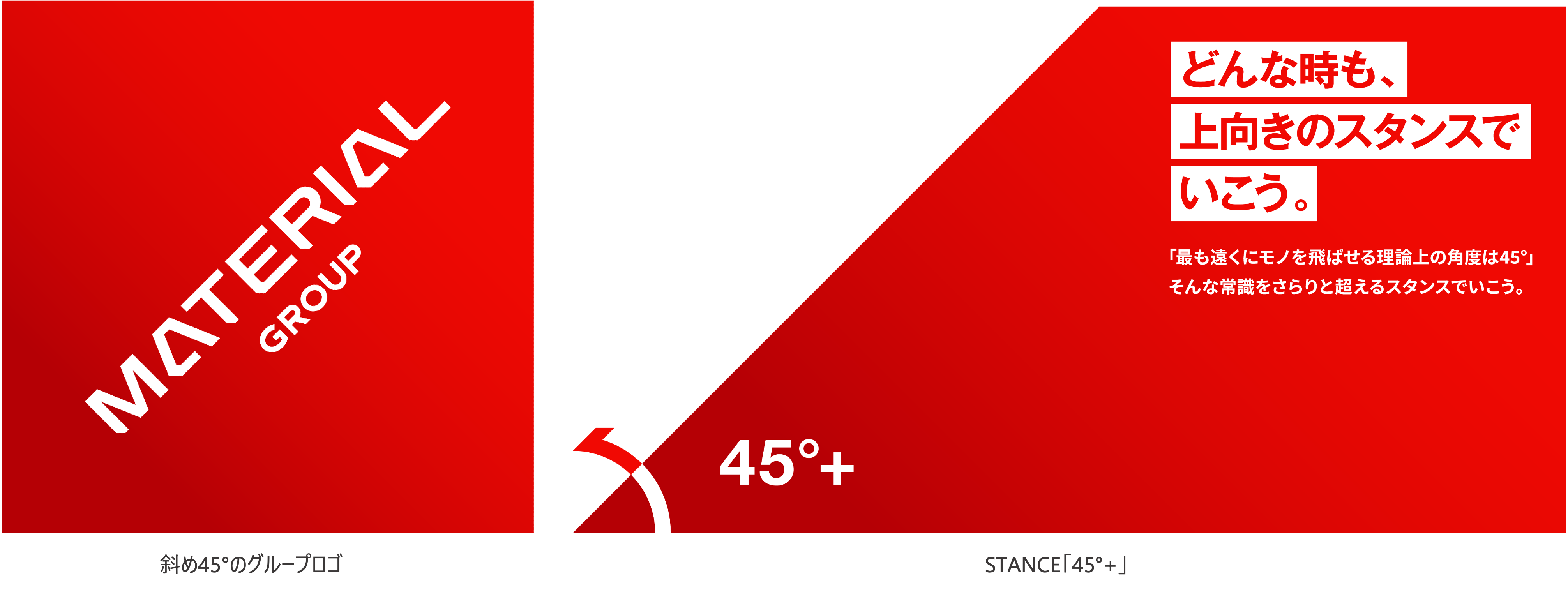 また、メンバーが根底に持っている「上向きのスタンス」は、マテリアルグループと個人が今後も進化を続けるうえで決して欠かすことのできないものです。その上向きのスタンスを「45°+」と名付け、世界でも類を見ない「45°の斜めロゴ」が生まれました。これらは、マテリアルグループとして挑戦を続けていくという宣言であり、あらゆる「個性」を引き出し、その可能性を最大化させる、壮大なストーリーの幕開けを意味するものです。