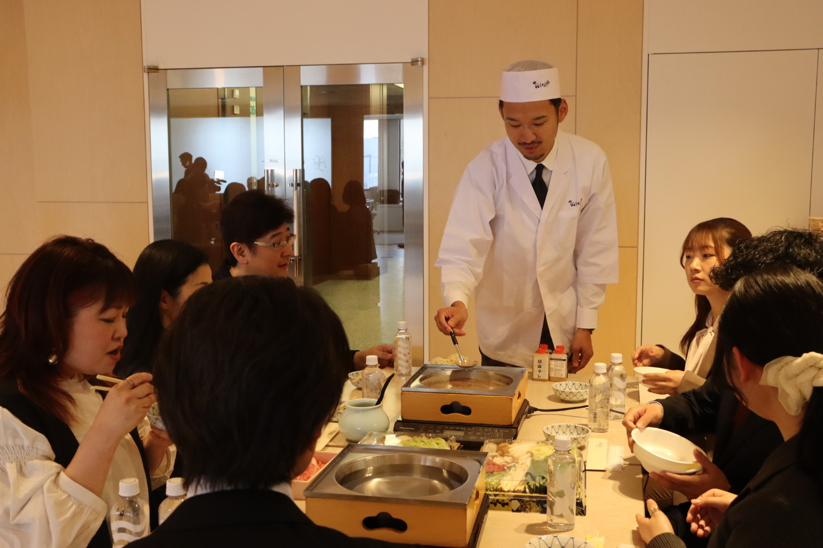 贈呈式後、オフィスのエントランスにて、滋賀県近江八幡市の老舗料理店「ひょうたんや」が提供するA5ランク近江牛のしゃぶしゃぶ(初任牛)を、割烹着姿の役員たちより振る舞い、新入社員とご家族がともに「初任牛」をおいしく実食しました。