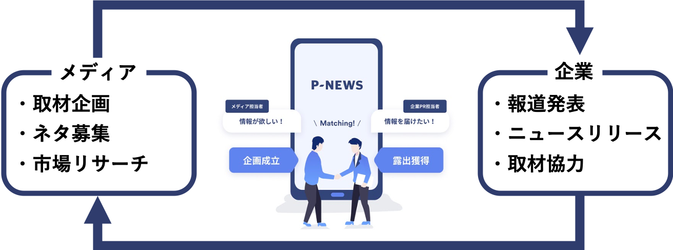 『P-NEWS』は、メディアと企業の広報・PR担当者を1to1でつなぐ、次世代のプラットフォームです。『P-NEWS』サービスは、ブラウザ版のみならず、アプリケーション版の展開により、柔軟な利用が可能です。