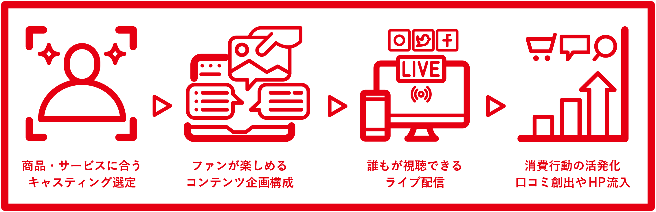 ブーストプラン:ライブ配信の告知や配信後のPR活動をはじめ、特定のWEB媒体とのタイアップやSNSなどの広告を活用したターゲティング配信を実施。配信者のファンが持つ熱量や関連メディアの読者、情報を届けたいターゲットへのプッシュをおこなうことで、配信コンテンツの認知、ECサイトやHP等への誘導を図ることが出来ます。