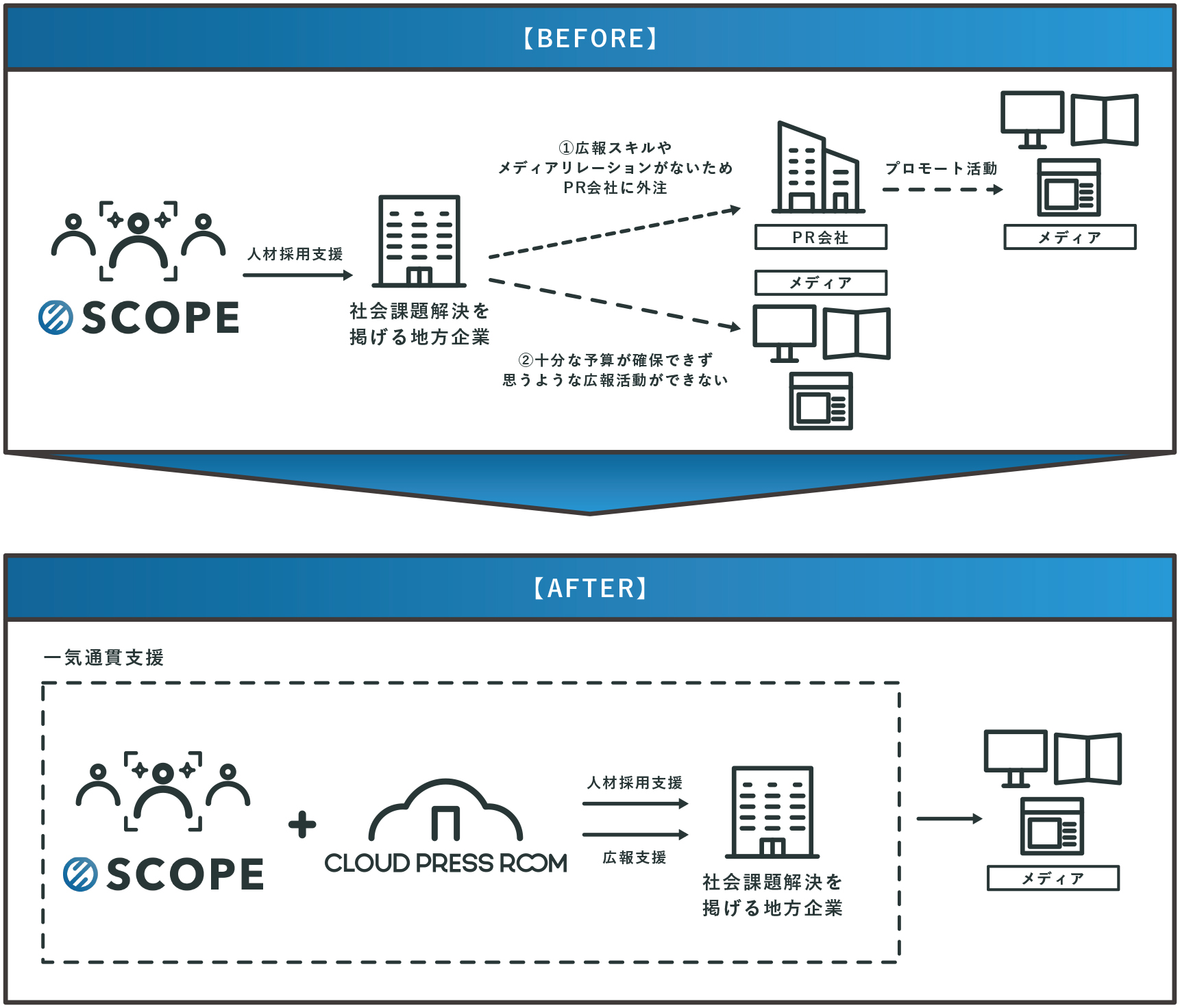 本提携は、アスタミューゼが運営する人材採用支援システム「SCOPE」の利用顧客に対して、PRプラットフォーム「CLOUD PRESS ROOM」の活用を促進します。また、多くの地域企業の広報・PR担当者の業務支援を実施することで、より一層の地域活性化を図ります。