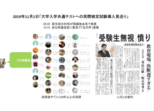 例えば、去年の秋に「大学入学試験の民間検定試験の見送り」という出来事があった際に、『あな特』から読者に向けて「これに対してどう思いますか?」とアンケート調査を実施し、その結果を記事として掲載したことがありました。その後、文科相が会見をしたわずか40分後に、再度「緊急アンケート」を呼びかけたところ、当時授業中であるはずの高校生や教員の方からも、続々と回答が集まったそう。これらの声をもとに、『あな特』は連鎖的に「大学入学試験の民間検定試験の見送り」に関する記事を作成しました。このように、読者との双方向のやり取りの実現によって、「ダイレクトに繋がって、ともに報道する」という”新たな形のコミュニティ”が形成されたと言えます。