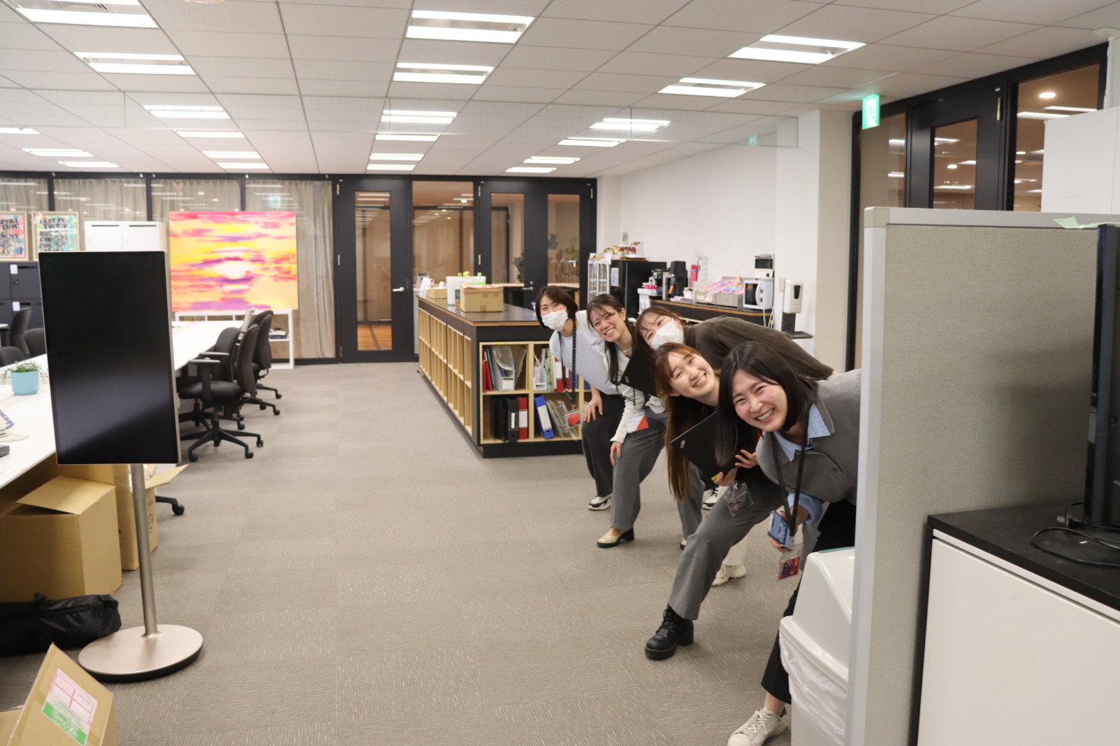猫の写真に気づいたメンバーからは「朝からのミーティングだったけど、会議室に猫の写真があって癒された!」という声も。緊張感のある空気が流れがちな会議中も、ふと壁を見ればかわいい猫(と犬)と目が合う……そんな温かい空間が広がっていました。