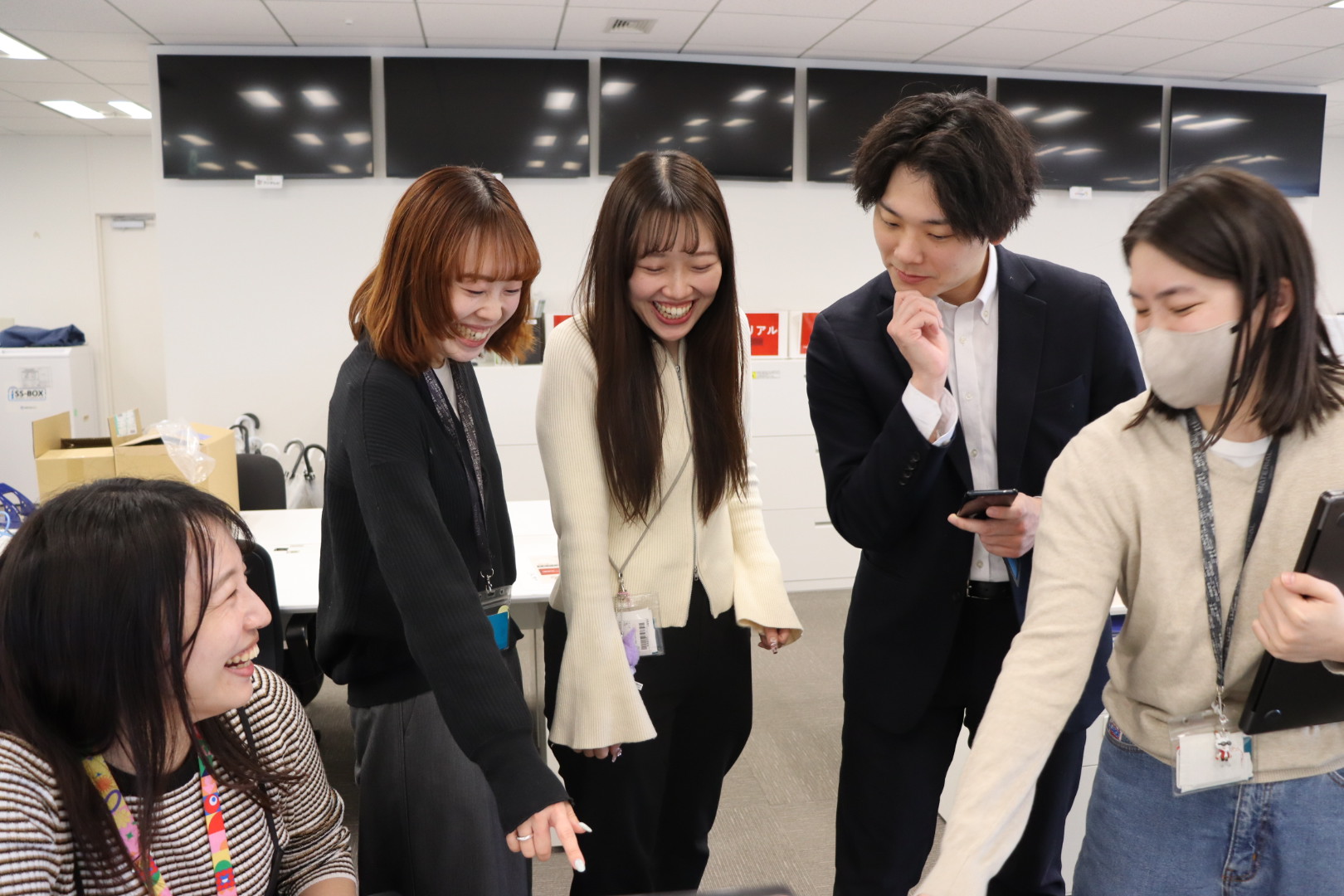 今回は社内チャットで問題を一斉案内し、回答を広報チームに報告する形式で実施。 先着での景品プレゼントもあり、オフィス内では資料を片手に答えを探し、分かった人から答え合わせに駆け寄る姿が見られました。