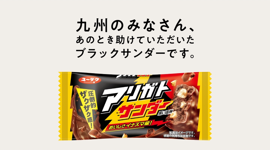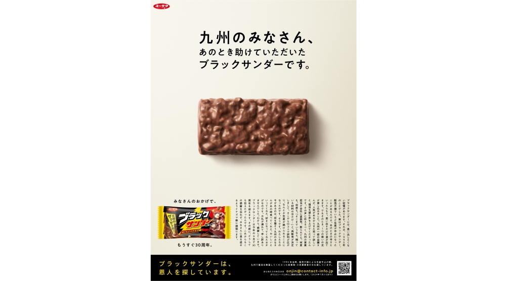 有楽製菓が展開する『ブラックサンダー』が、2024年9月に発売30周年を迎えるにあたり、過去に、販売不振によるブランド存続の危機を救ってくれた九州の人々に感謝を伝えたいという想いから、『ブラックサンダー』の恩返し企画を実施。九州7県の新聞での広告掲出をはじめ、天神地下街での限定パッケージ「アリガトサンダー」のサンプリングイベントや、販売不振による一時生産終了時に、復活を熱望し声をあげてくれたブランドの「恩人」を探す企画などを展開した。
