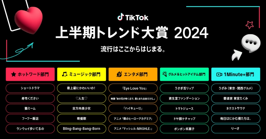 TikTokが、2024年上半期にTikTokで流行したさまざまなトレンドを、「TikTok上半期トレンド大賞2024」としてまとめ、5部門25選のノミネートを発表。その後、各部門賞と大賞の発表を、6月20日に開催された授与式にて実施した。