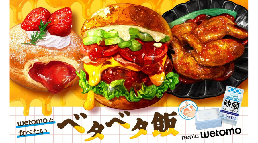 王子ネピアが、ウエットティシュの新商品『wotomo』の発売にあたり、使用頻度が高い「食事」のシーンを軸とした企画を立案。特に、“手がベタベタになるけれどおいしい料理”に着目し、それらを「ベタベタ飯」と名付けてキャンペーンを実施した。